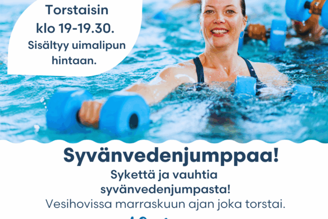 Marraskuun ajan torstaisin klo 19.00-19.30 syvänvedenjumppa. Sykettä ja vauhtia altaan syvästä päädystä! Matalassa päädyssä voi samanaikaisesti jumpata Hydrohex-ohjattua vesijumppaa. Sisältyy uimalipunhintaan.